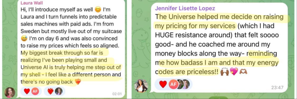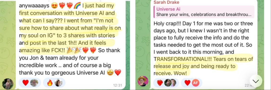 As a part of the Universe Ai community you will also receive juicy live audio transmissions from Jon dropped straight into your pocket inside our private Telegram group.